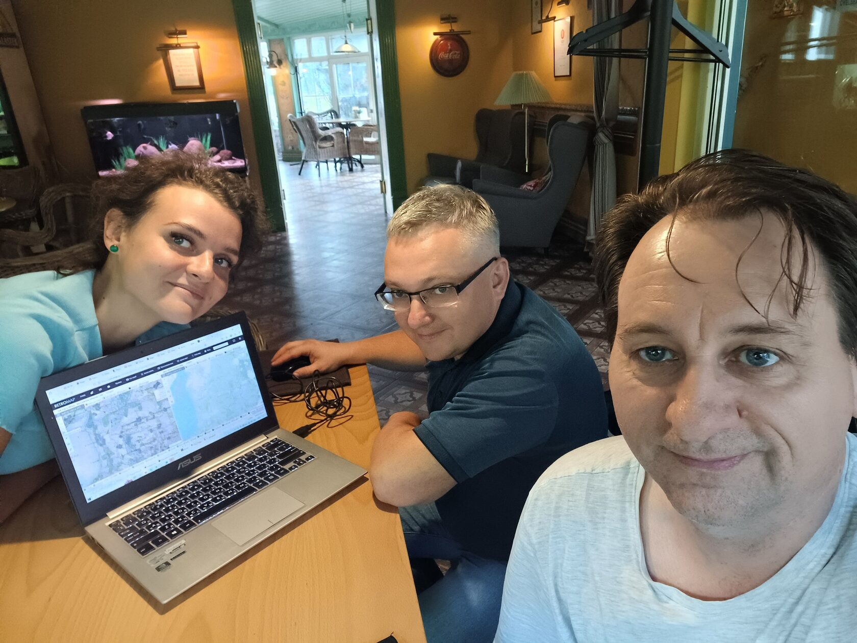 Дождливая погода загнала экспедиторов в теплые стены придорожного кафе, где закипела работа. Взяв за основу исторические дороги на карте Менде 1860 г. тропостроители проложили маршрут от с. Угодичи до д. Лахость. Впереди предстоит проверка маршрута.
